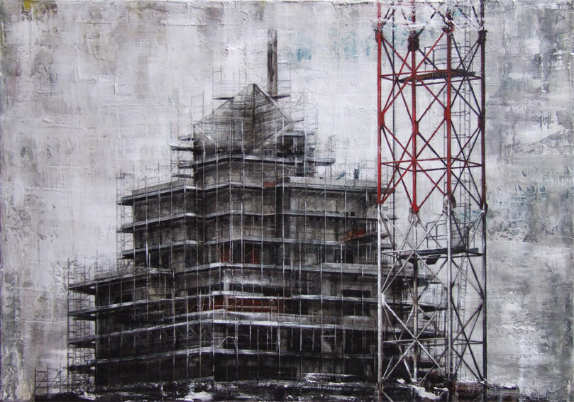 Esporre le opere nel ristorante di Borghese per lui è un’occasione unica, soprattutto perché possibile durante il periodo della Biennale Architettura. I lavori di Trecchi infatti sono intrinsecamente legati ai temi dell’architettura, lanciando il messaggio che questa non possa prescindere dal dato naturale per permettere all’uomo, mai direttamente rappresentato, di vivere una vita più sana e rilassata. Trecchi ha iniziato a dipingere partendo col raccontare esclusivamente aree dismesse, per poi passare a rappresentare le costruzioni della città sospese in scenari quasi apocalittici, impostando vertiginose visioniprospettiche con lunghe vie di fuga. La tematica urbana è poi progredita nel tempo fino a concentrarsi sul rapporto con la natura. Nel recente progetto “Naturae” presenta infatti opere in cui gli alberi sostituiscono gli edifici disegnando una nuova urbanistica: <Il mio rapporto con la natura è iniziato piano piano fino ad arrivare a rappresentarla sempre>.