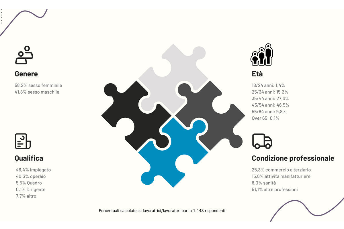 Dei 1.143 rispondenti all’indagine svolta da Fondazione Corazzin, su un campione composto da lavoratori e lavoratrici che si sono rivolti al sistema servizi di Cisl, circa il 60% è formato da donne e a livello di età il 46,5% ha fra i 45 e 54 anni e il 27,0% tra i 35 e i 44 anni e il 15,2% ha fra i 25 e 34 anni. I settori di provenienza sono per un quarto (25,3%) il commercio e terziario, il manifatturiero per il 15,6% mentre l’8% viene dalla sanità. Per il 46,4% si tratta di colletti bianchi, tutte blu per il 40,3% e quadri per il 5,5%.