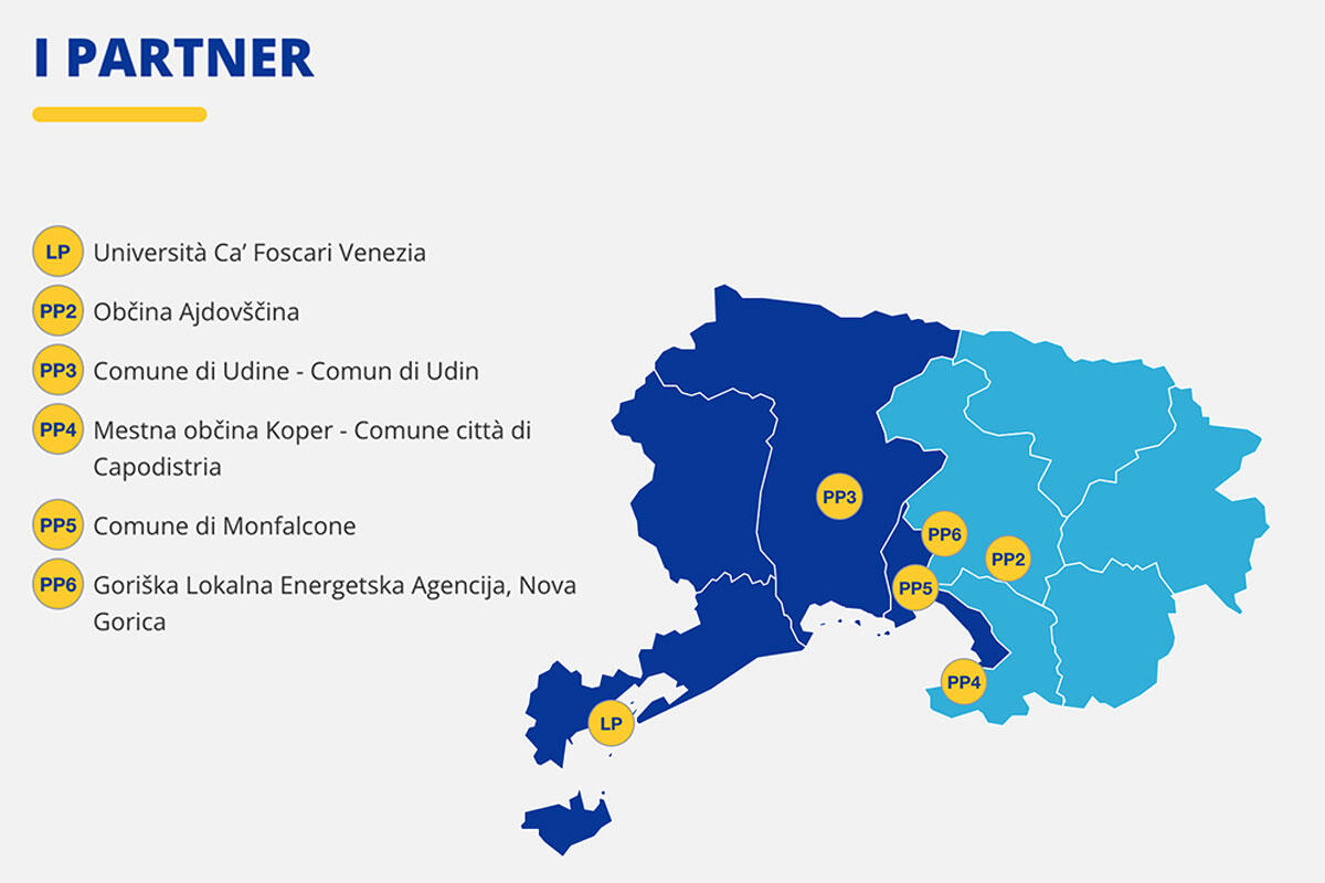 Il progetto, avviato a giugno 2024, avrà una durata di due anni e si concentrerà nell’area transfrontaliera, coinvolgendo sotto la guida dell’ateneo veneziano altri cinque partner. Si tratta dei comuni di Ajdovščina, Udine, Capodistria, Monfalcone e Golea, l’Agenzia locale per l’energia Goriška, a cui si aggiungono altri sette soggetti associati a sostegno dell’iniziativa: la Regione Veneto con la propria Unità Organizzativa programmazione unitaria di Area (Fesr Fsc), il Ministero dell’Ambiente, del Clima e dell’Energia, l’Agenzia pubblica per la promozione dell’imprenditorialità e lo sviluppo di progetti del Comune di Izola, il Centro di sviluppo Posoški, l’Agenzia di sviluppo regionale ROD Ajdovščina, l’Associazione dei Comuni urbani della Slovenia e l’Iniziativa Centro Europa Segretariato Esecutivo.
