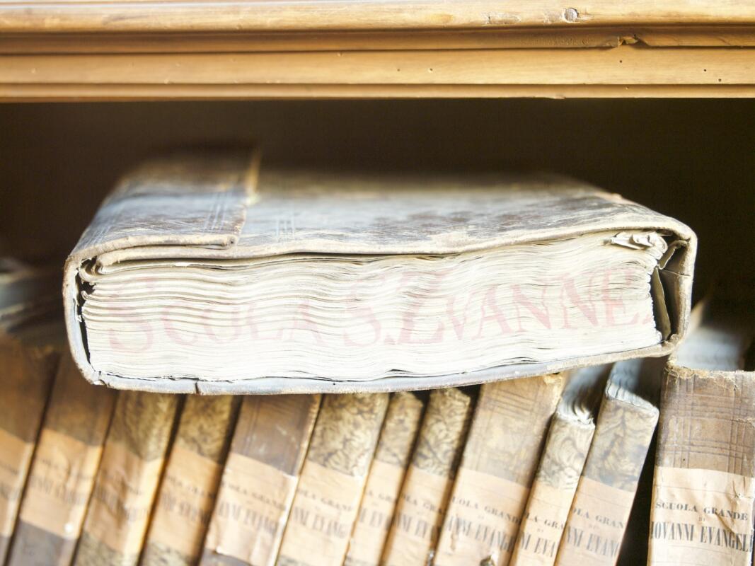 Dell’Archivio di San Giovanni Evangelista non si è conservato l’atto fondativo della Scuola ma una sua copia. «I documenti partono dal 1300 e arrivano fino all’ultimo del 1806» spiega il direttore. Cosa curiosa è che per l’Archivio la soppressione Napoleonica è il momento principe. È giovedì 25 aprile del 1806 quando Napoleone decide la soppressione delle Scuole. I napoleonici sono di un’efficienza sorprendente: già domenica 4 maggio convocano il Guardian Grande, Battista Casoretti, dicendo che il giorno seguente ci sarebbe stata la soppressione e mettono una guardia Civica davanti alla Scuola per evitare il fuggi fuggi, ma nonostante questo l’archivista, Giovanni Dionisi, riuscì a scappare. «Come risulta dai dati d’archivio della Scuola, il giorno seguente, alle 10 del mattino, con un notaio, alla presenza del Guardian Grande e dei confratelli che avevano ruoli gestionali, i napoleonici vanno nella sala dell’archivio e la sigillano. – spiega Erboso – Come prima cosa fanno una ricognizione di quello che c’è nella Scuola, dove trovano argenti, reliquiari, arredi sacri, suppellettili, distinguendo quelli con oro e argento. Annotano i mobili e le cose affisse, cioè i quadri, per un valore complessivo di 35 mila lire venete». Fanno l’inventario di tutto ma non dell’Archivio: «Quello in fatti non va venduto perché serve per continuare ad amministrare i beni della Scuola». Nell’Archivio infatti in particolare è conservata la Mariegola, la regola madre, strumento d’uso vissuto con aggiunte, note e integrazioni che vanno avanti anche per 200 anni: «Le mariegole sono documenti vivi che cambiano nel tempo, per questo sono deperibili. Danno uno spaccato della società nei secoli, non solo perchè perchè presentano informazioni sui confratelli ma soprattutto in quanto tengono conto dell’attività assistenziale della Scuola verso orfane e poveri, redigendo nota anche di abitazioni, terre e affitti della confraternita» dice Erboso.