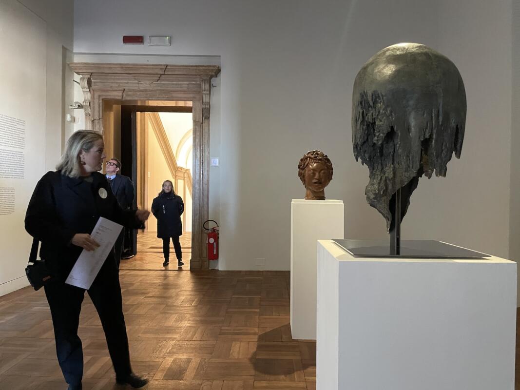 Nel marzo 1944 Arturo Martini comincia a scrivere il suo celebre testo “Scrittura lingua morta” che verrà pubblicato nel 1945. È proprio prendendo spunto da questo scritto sull’incapacità della scultura di essere viva e universale che prende nome la mostra di Giorgio Andreotta Calò nelle Sale Dom Périgonn della Galleria Internazionale d’Arte Moderna di Ca’ Pesaro a Venezia. “Scultura lingua morta” è la mostra visitabile fino al 4 marzo, a cura della direttrice del museo Elisabetta Barisoni, con cui Ca’ Pesaro intende ancora una volta valorizzare le collezioni del museo inserendole in mostre dedicate alle indagini contemporanee, come sta facendo anche per la mostra di Roberto Matta (leggi qui). Nella prima sala ad accogliere i visitatori prende subito voce l’inedito dialogo tra Giorgio Andreotta Calò e Arturo Martini attraverso il linguaggio e le riflessioni sulla scultura. La scultura “Testa di Medusa” in legno del 1929 di Martini, appartenente alle collezioni del museo, è posta infatti in stretto dialogo con la scultura bronzea con fusione a cera persa “Medusa”, realizzata nel biennio 2020-2022 da Andreatta Colò.
