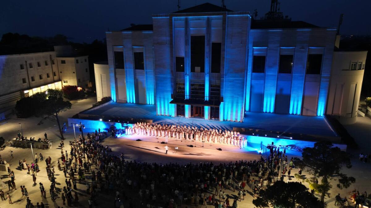 Per l’occasione è stato inaugurato il videomapping “Forme e colori di una scoperta” ispirato alla scoperta del bosone di Higgs, avvenuta nel 2012 al CERN di Ginevra e premiata con il Nobel per la Fisica nel 2013 ai fisici che ne avevano teorizzato l’esistenza. Il videomapping, curato dall’Istituto Nazionale di Fisica Nucleare (INFN) e realizzato da Luca Agnani Studio, è stato pensato in occasione del convegno ”Open Symposium on the European Strategy for Particle Physics – 2026 Update”, organizzato dal CERN e dall’INFN e tenutosi proprio all’interno del Palazzo del Casinò. Alla prima serata di proiezione il videomapping ha fatto così da quinta teatrale nel modulare gli effetti di luce del concerto-spettacolo della formazione corale veneziana, per poi restare proiettato ogni sera fino a giovedì 26 illuminando esternamente la facciata del Palazzo del Casinò, che ha preso i colori e le sembianze degli strumenti che sono stati costruiti per realizzare questa impresa scientifica: dal più potente acceleratore di particelle al mondo, il Large Hadron Collider, ai rivelatori ATLAS e CMS grandi come cattedrali. La caccia al bosone di Higgs è durata quasi cinquant’anni ed è stata possibile solo grazie all’impegno di decine di Paesi, centinaia di Istituzioni scientifiche e migliaia di persone, a cui l’Italia ha contribuito con il lavoro della comunità scientifica dell’INFN.