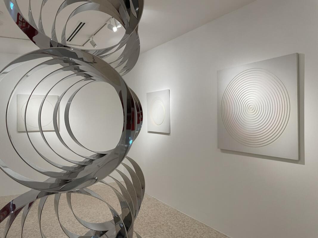 Molteplici sono le linee di ricerca presenti in mostra, attorno e al di là del cerchio, tra strutture e linee, diverse tecniche e materiali, che spingono la forma oltre i limiti della superficie e della cornice, dinamizzando lo spazio e la percezione. Il cerchio ritorna ossessivamente in infinite variazioni e nella ripetizione si carica di un valore simbolico e rivela il desiderio di espansione e fusione. Questo si svela in tessiture grafiche, anelli concentrici o eccentrici dallo spessore progressivo o digressivo, che escono dalla bidimensionalità. La percezione spaziale è alterata, come spiega l’artista, da una pulsione «attrattiva-espansiva e fluido-elastica», che fin dai primi esperimenti d’attivazione del cerchio ricorre all’uso del giradischi per testare le potenzialità e visualizzare gli effetti percettivi delle opere, seguendo intuitivamente le orme di Marcel Duchamp. Oltre alle ormai iconiche “Dinamiche circolari”, serie iniziata nel 1963 di oggetti statici e mobili che esplorano la struttura e le possibilità di attivazione del cerchio, in mostra sono presenti anche i “Rilievi”, strutture metalliche tra i primi lavori dell’artista, realizzati nel corso degli anni ‘60 e ‘70. Non mancano sculture strutturate attorno al cerchio e alla sua moltiplicazione, caratterizzate dal potere riflettente del metallo. Il percorso espositivo prosegue con l’eleganza delle “Gradazioni”, pitture in cerchi concentrici realizzate nella seconda metà degli anni ’70, che come i “Rilievi” sono concepite a coppie, in una sorta di dittici dalla struttura inversa, speculare o cromatica.