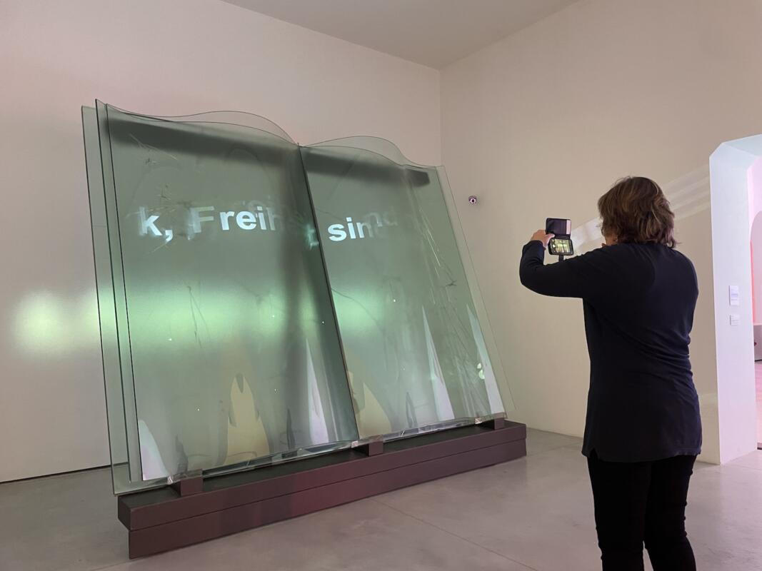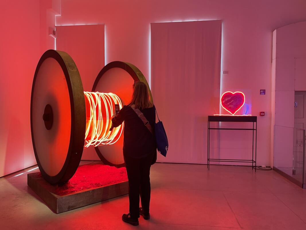 Significative poi le grandi opere “L’Archivio della memoria”, un grande libro in vetro con retroproiezionededicato a tutti i libri e gli archivi devastati dall’intolleranza umana, e “Il volo impossibile” di un grande aquilone in vetro. La memoria infatti per l’artista è leggera perché evanescente e vola via «così come gli archetipi della mia arte che ritornano a visitarmi periodicamente» dice l’artista. Domina infine, sulla parete in fondo all’entrata della sala, l’opera a led “Art has no sex”: «Non avete idea di quanta fatica ho fatto agli inizi, quando l’arte non era considerata una cosa per donne» spiega l’artista, che nell’ultima sala presenta una grande bobina da cui si srotola un filo rosso, che rappresenta la sua vita. «Per un artista avere una lunga vita vuol dire molto, è il tempo infatti a creare la memoria. Spero che di tutto questo percorso, simboleggiato dal filo rosso al neon che ho realizzato, ne resti traccia».