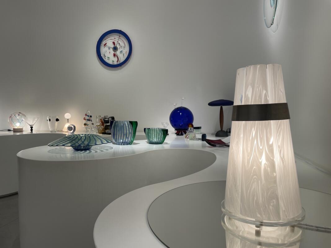 «Ad accogliere i visitatori all’ingresso del museo l’opera “La bricola”, realizzata nel 1971 su richiesta di Giò Ponti per l’Euro-Domus di Torino: un prototipo che darà poi il via ad una serie a lampade di design» spiega la critica d’arte Roberta Semeraro. Lo spazio delle “ex Conterie” si articola in più sezioni. Si parte dagli anni ’70 e ’80 in cui trova posto, tra gli altri, il gruppo “Natura sotto vetro”, le lampade a matita e molti bozzetti di lavori poi presentati su vasta scala. Opere monumentali esposte nelle principali città di tutto il mondo che sono poi state miniaturizzate dall’artista in originali gioielli da indossare. Tra questi spiccano l’anello e il pendente “La gabbia” con cubo in vetro azzurro all’interno, ispirato all’opera “La Gabbia di Luce” istallata a Tenerife nel 2004. In mostra anche la ricerca portata avanti dall’artista negli anni sull’uso dell’elettronica, come le opere “Broken Comunication” e “Crashed Tv”, realizzate da Signoretto, in cui al vetro di Murano sono accostate tv esplose, segno di una comunicazione impazzita. Dialoga con queste “Stairway to heaven” del 1998, una scala di vetro in cui sopra l’ultimo gradino è appoggiata una TV in vetro massiccio con inclusioni di bolle d’aria: «Mi immagino che arrivati in paradiso ci dicano “ora siediti e guarda”» ironizza l’artista.