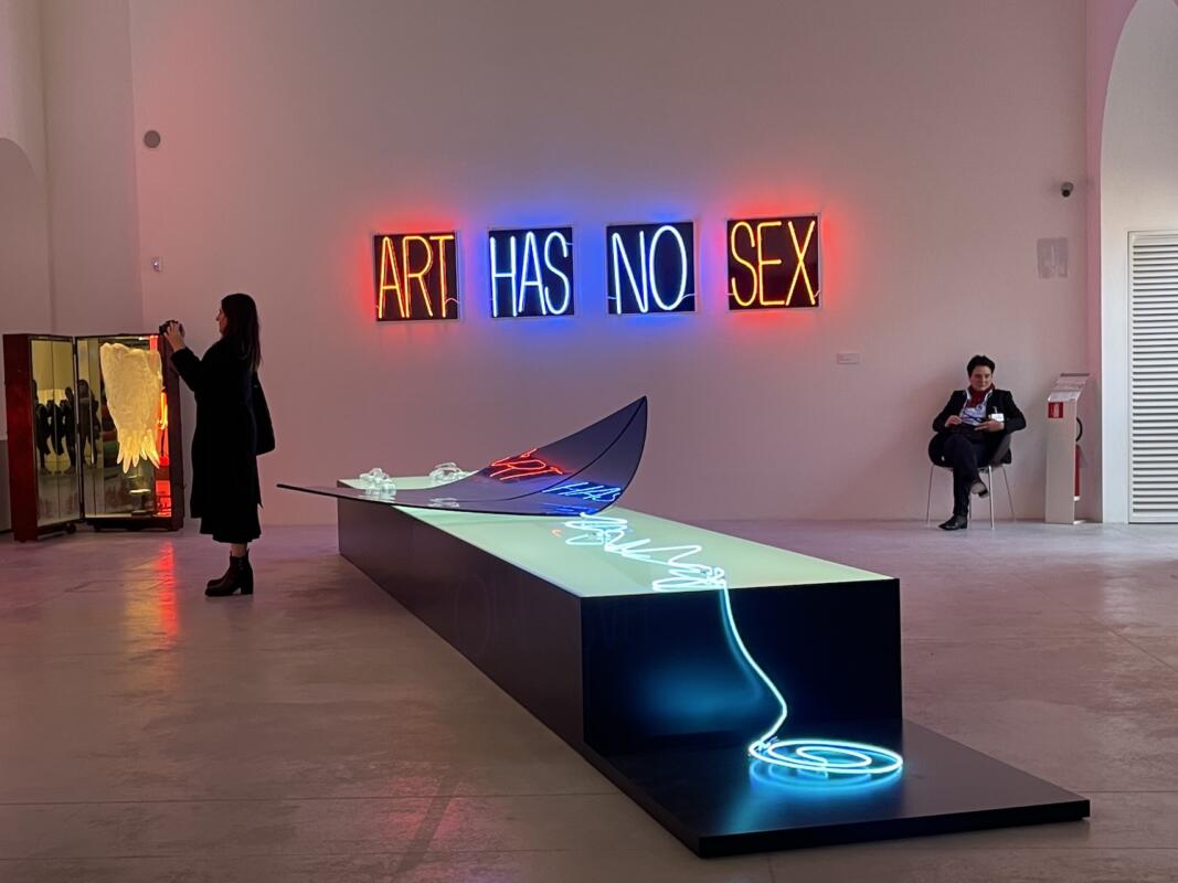 Significative poi le grandi opere “L’Archivio della memoria”, un grande libro in vetro con retroproiezionededicato a tutti i libri e gli archivi devastati dall’intolleranza umana, e “Il volo impossibile” di un grande aquilone in vetro. La memoria infatti per l’artista è leggera perché evanescente e vola via «così come gli archetipi della mia arte che ritornano a visitarmi periodicamente» dice l’artista. Domina infine, sulla parete in fondo all’entrata della sala, l’opera a led “Art has no sex”: «Non avete idea di quanta fatica ho fatto agli inizi, quando l’arte non era considerata una cosa per donne» spiega l’artista, che nell’ultima sala presenta una grande bobina da cui si srotola un filo rosso, che rappresenta la sua vita. «Per un artista avere una lunga vita vuol dire molto, è il tempo infatti a creare la memoria. Spero che di tutto questo percorso, simboleggiato dal filo rosso al neon che ho realizzato, ne resti traccia».