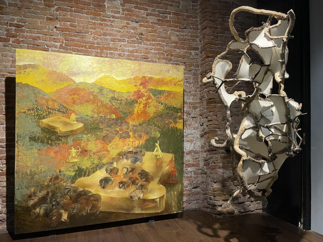 Tra le opere degli studenti esposte, spicca quella di Rebecca Zen che, partendo da due fette di pane in cassetta, ha colto la provocazione del prof. Di Raco di realizzare degli indiani che fuggono da mandrie di bisonti: «Sono temi da me già trattati che qui dovevo riuscire ad incastrare sul piano prospettico e di andamento». “Al primo sparo non si daranno alla fuga”, questo il titolo dell’opera, che riprende una frase del fumetto Tex, che porta in scena una ricerca-paradosso, in quanto quelli ritratti sono dei soldatini giocattoli e quindi la violenza rappresentata è in realtà finta. «Mi interessa la contrapposizione tra i giocattoli con connotati violenti e la morbidezza del pane» spiega Zen. Si concentra invece sulla figura umana la grande opera di Simone Rutigliano. «Mi interessano le danze popolari e i rituali. Dicono che abbia un’influenza classica ma in realtà nelle mie opere ci sono molti particolari astratti» dice. Se al centro del dipinto compare, con un tratto ben controllato, la schiena definita di una donna, l’immagine poi si allarga perdendo via via definizione, in particolare nella resa delle teste e dei piedi delle figure. Totalmente diverso invece il campo di ricerca di Giorgia Pirani che lavora sul tema del contatto ritraendo mani e capelli: «Il mio è un processo meditativo – dice -, prima inizio dal disegno e solo successivamente passo alla tela». Le sue opere sono esposte su una parete che presenta piccoli lavori dai diversi linguaggi realizzati della maggior parte degli artisti che hanno preso parte al workshop, un pannello che serve a far percepire ai visitatori la varietà delle opere prodotte e fare una sintesi dei vari linguaggi, tecniche ed esperienze presenti all’interno della mostra.