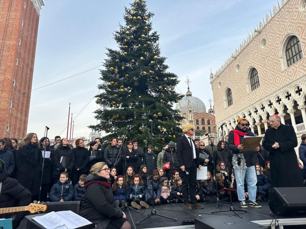 “Arriva il Re della Pace”, questo il titolo del tradizionale incontro della Carità rivolto ai bambini delle elementari della Diocesi. L’incontro, ormai un appuntamento storico, atteso da tutti i bambini all’inizio dell’Avvento, aiuta ad entrare nel tempo di attesa, l’attesa di questo Re della Pace che deve venire. Sotto il grande albero di Piazza San Marco, i bambini assieme a genitori e catechisti si sono ritrovati ad aspettare l’arrivo del Patriarca Francesco, accolti dal grande coro della parrocchia di San Giovanni Evangelista di Mestre, che ha allietato con i canti l’intero incontro. Con un piccola e simpatica rappresentazione l’incontro è iniziato con l’arrivo di una lettera speciale direttamente dalla Terra Santa, da parte del Patriarca di Gerusalemme Pizzaballa, che, scrivendo a nome della parrocchia della Santa famiglia di Gaza, ha chiesto preghiere per la pace e un aiuto materiale per le persone che hanno perso tutto in questo tempo di guerra.