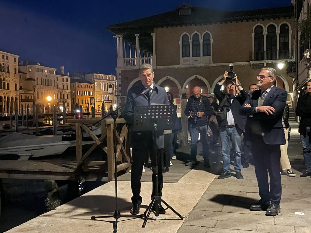 Nel buio della notte ora la facciata della Ca’ d’Oro emerge come pura luce. La nuova illuminazione del noto palazzo veneziano è stata finanziata da Venetian Heritage con la Maison Pomellato, e si inserisce all’interno del più ampio progetto che ammonta a 7 milioni di euro per il completo rinnovo della Galleria Giorgio Franchetti alla Ca’ d’Oro, promosso da Venetian Heritage in collaborazione con la Fondazione Giulio e Giovanna Sacchetti. La suggestiva presentazione della nuova illuminazione si è tenuta nella serata di lunedì 16 nella opposta Fondamenta dell’Ogio, davanti all’Hotel l’Orologio, alla presenza della Presidente di Venetian Heritage Valentina Marini Clarelli Nasi, del Direttore generale Musei del Ministero della Cultura Massimo Osanna e dell’amministratore delegato di Erco Andrea Nava. Il nuovo impianto di illuminazione, guidato da Venetian Heritage e dalla Direzione regionale Musei Veneto, è stato realizzato dall’arch. Alberto Pasetti Bombardella dello Studio Pasetti, specializzato nella valorizzazione dei beni culturali, ed è stato coordinato dall’arch. Giulia Passante, direttore dei lavori per il restauro della Galleria Giorgio Franchetti. La realizzazione inoltre ha visto come partner tecnico Erco, azienda leader globale nel campo dell’illuminazione architettonica a Led sostenibile che ha fornito i corpi illuminanti, e la Ditta Spazioluce per l’installazione.