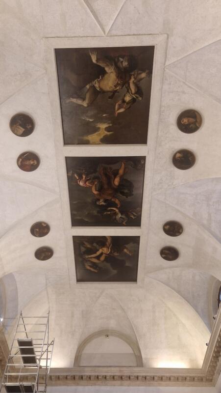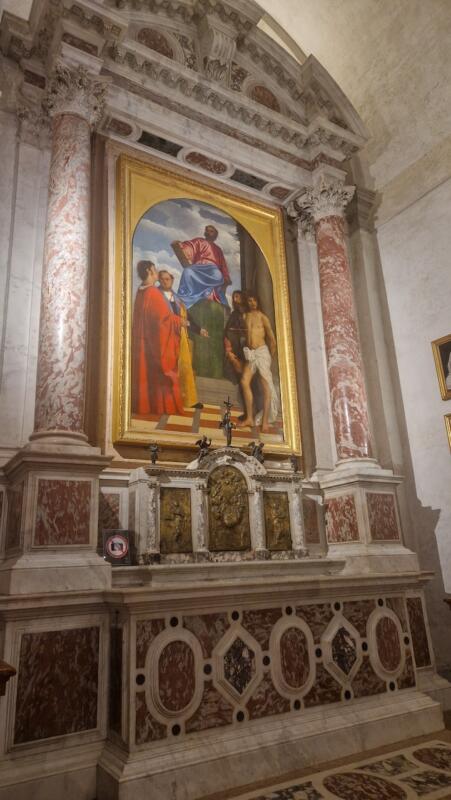 In effetti alla Salute ci sono altre tredici opere del Vecellio, dodici tele e una tavola. Tutte arrivarono nel 1656 dalla chiesa nell’isola di Santo Spirito, poco più a sud della Giudecca, per secoli “porta d’ingresso” alla laguna di Venezia e perciò rilevante. L’isola ospitava dal ‘400 i frati Eremitani, che costruirono una chiesa su progetto di Sansovino e la arricchirono con tele di Palma il Vecchio e, appunto, di Tiziano. Quando Papa Alessandro VII ne soppresse l’ordine, nel 1656, il Senato veneziano ne vendette i beni, ricavandone il necessario per sostenere le spese della guerra di Candia. Perciò le preziose opere d’arte furono trasferite nella chiesa della Salute, di cui si stava ultimando la costruzione. Così oggi, in basilica e in sacrestia, si possono ammirare dodici dipinti del Vecellio, dalla tavola con San Marco in trono (del 1510) alle tele che raccontano le vicende bibliche di Caino e Abele, del sacrificio di Abramo ed Isacco e di Davide e Golia, oltre ai tondi con i quattro evangelisti e quattro Dottori della Chiesa. Ora tutti riuniti alla Maddalena penitente.