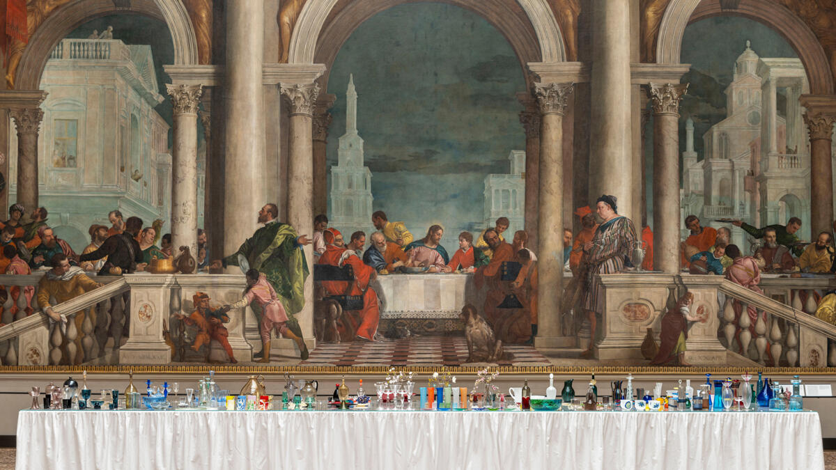 La storia del vetro da tavola muranese, prodotto dagli anni Venti del Novecento a oggi, va in scena proprio su una tavola monumentale allestita davanti ad una tra le più celebri ed emblematiche scene di banchetto del Rinascimento veneziano: il telero “Convito in casa di Levi” di Paolo Veronese del 1573. L’opera, che era stata concepita per rappresentare l’Ultima Cena, cambiò titolo dopo essere stata oggetto di censura da parte del Sant’Uffizio, che accusò il pittore di eresia per aver trattato senza il giusto decoro il tema religioso. Nei dipinti veneziani rinascimentali, di cui alcuni notevoli esempi oltre all’opera di Veronese sono conservati alle Gallerie, si possono osservare diversi modelli, quali bicchieri, calici, brocche, caraffe, piatti, coppe e compostiere, che ispirarono all’inizio del XX secolo una rinascita estetica della produzione vetraria da tavola muranese.