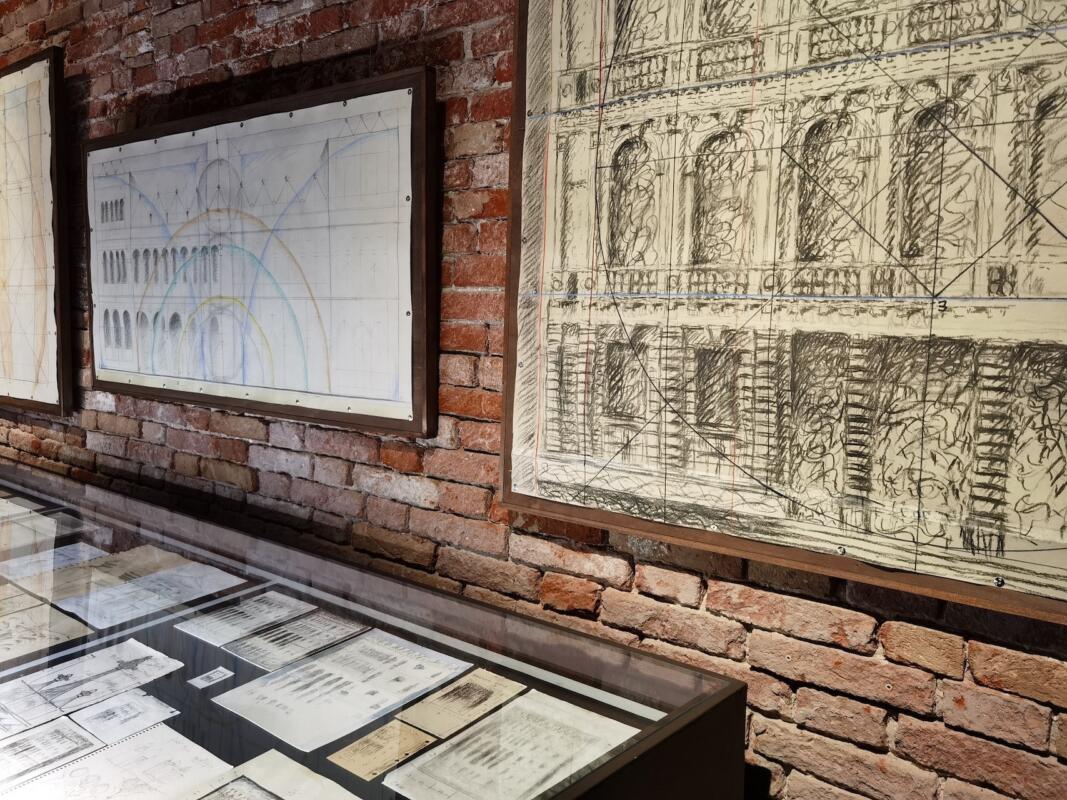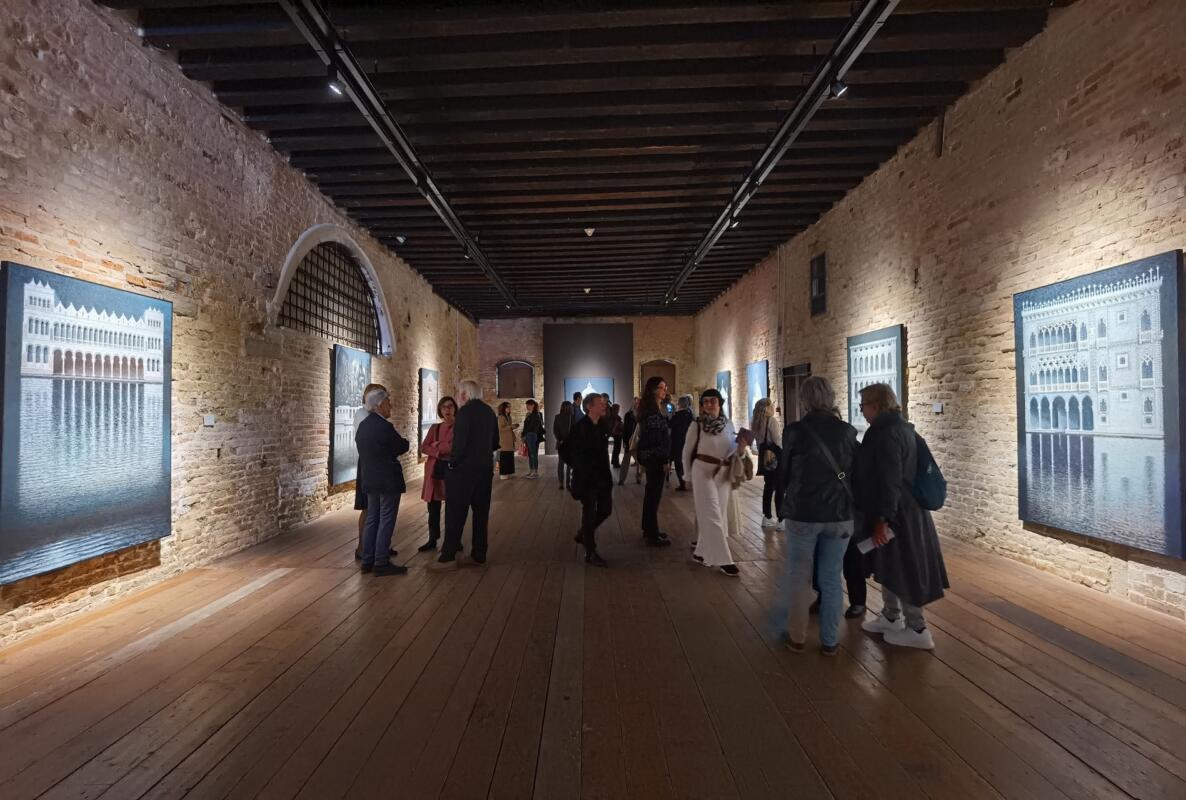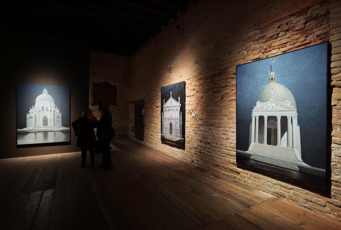 Le opere esposte a Palazzo Fortuny fanno parte della serie di stampo metafisico “Riflessioni notturne”, realizzate tra il 2018 e il 2023, che dà appunto il titolo all’esposizione. In mostra spiccano la Dogana de Mar, che pare quasi sospesa, il Fondaco dei Tedeschi e le chiese della Salute, di San Marcuola e San Simeon Piccolo, dove dalla porta socchiusa si intravede uscire una luce. Tutte queste, grazie ad una suddivisione spaziale della tela, si specchiano nel Canal Grande, molte volte privilegiando l’immagine riflessa. In mostra non manca un’originale realizzazione di Ca’ Venier dei Leoni, palazzo che fu casa di Peggy Guggenheim e che oggi è sede del museo che porta il suo nome. Proprio il palazzo, che restò incompiuto e non vide la realizzazione del piano superiore, nell’opera assume una sorta di metamorfosi grazie ad un intrecciarsi di forme scure e misteriose che paiono richiamare l’idea di un’architettura incompiuta e il clima avanguardistico e surrealista vissuto dalla Guggenheim. <Presiede al tutto un’analisi dei rapporti geometrici che legano gli elementi compositivi in una visione non prospettica, ma proiettata ortogonalmente alla tela per non alterare la geometria delle forme. – è l’analisi della Dirigente Area Attività Museali, Chiara Squarcina, che ha curato la mostra – Una luce notturna raccorda e unisce tra di loro gli elementi, conferendo alle architetture un’atmosfera metafisica non nuova nella ricerca dell’artista veneziano in quanto costituisce il fil rouge che sottende la sua ricerca degli ultimi decenni>.