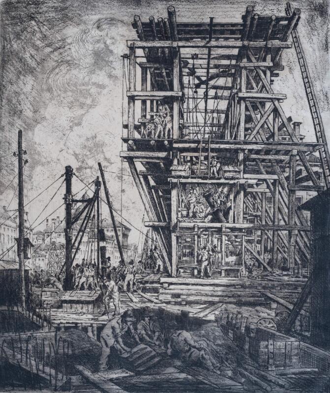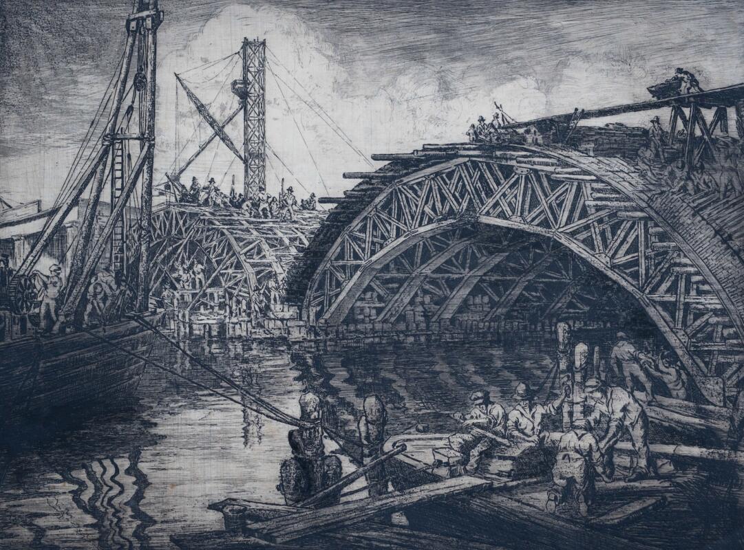 Una sezione della mostra è dedicata alla Venezia in cantiere e ai rinnovamenti urbanistici tra gli anni Venti e Tenta, a partire dalle acqueforti del 1918 che ritraggono i luoghi del lavoro e dell’operosità come il porto e la marittima, fino alla produzione degli anni ‘30 incentrata proprio sui lavori che testimoniano una città in pieno cambiamento, con incisioni provenienti da un raro portfolio ritrovato e conservato dai familiari dell’artista con applicata un’incisione sulla costruzione dell’autorimessa comunale. In questo album erano conservate le opere dedicate ai lavori pubblici urbanistici, tra cui 4 incisioni incentrate sulla costruzione del Ponte Littorio, oggi meglio conosciuto come Ponte della Libertà, il collegamento translagunare i cui lavori furono seguiti dall’ingegner Miozzi. Le opere sono allestite in relazione ai video del tempo dell’Istituto Luce, con scene che in otto minuti riprendono proprio i momenti della costruzione del Ponte della Libertà. «Sono incisioni interessanti che hanno un grande valore documentaristico – afferma il curatore Marco Dolfin – I visitatori, oltre alle incisioni, grazie ai video e agli audio originali del tempo possono anche cogliere i rumori degli operai all’opera, immedesimandosi così nello stesso scenario che vedeva Giuliani quando osservava i lavori».