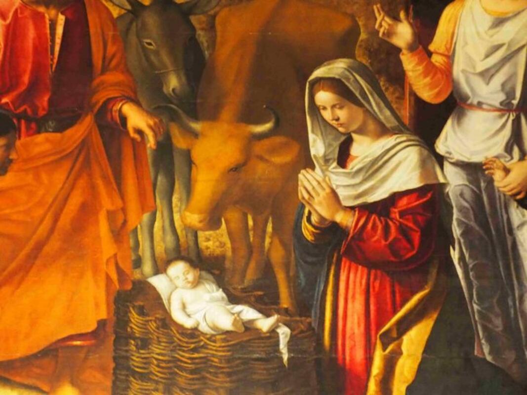 Entrare nella Chiesa di Santa Maria dei Carmini e trovarsi davanti all’“Adorazione dei pastori” di Cima da Conegliano, infatti, significa scoprire un dialogo profondo tra l’opera e il luogo che la ospita. La chiesa, infatti, affonda le sue radici nella storia dei Carmelitani giunti a Venezia nel Medioevo, un ordine legato alla Sacra Famiglia da una tradizione affascinante: «Secondo una leggenda, sarebbero stati proprio loro i custodi della casa di Nazareth, affidata da Maria, Giuseppe e Gesù. Non sorprende quindi che la scena della Natività, così centrale per la loro spiritualità, sia stata scelta per un altare. Cima da Conegliano, con la sua pittura a cavallo tra Quattrocento e Cinquecento, traduce questo legame in un racconto che unisce fede, memoria e simbolo». Il pittore utilizza gli elementi ricorrenti della tradizione iconografica: la grotta, Maria inginocchiata in adorazione, il Bambino deposto nella mangiatoia. Eppure rinnova tutto con scelte inattese: «Una delle più sorprendenti riguarda San Giuseppe. Di solito figura discreta, quasi marginale, qui diventa invece presenza centrale, punto di raccordo tra il cielo e la terra. È lui ad accompagnare il pastore verso il Bambino, gesto che sembra raccontare una paternità fondata non sul sangue, ma sulla scelta e sulla responsabilità». Ecco che in un tempo come il nostro, in cui la figura paterna è spesso messa in discussione, la bontà silenziosa di Giuseppe risuona con forza: «È l’uomo che rimane, che protegge, che accoglie un bambino non suo e decide di essere custode di una famiglia fragile e preziosa» sottolinea Brunet. Il pastore inginocchiato poi, non è un personaggio qualunque, ma il committente dell’opera, un mercante veneziano che si fa ritrarre in abiti pastorali, riconoscibile però dalle scarpe cittadine. Accanto a lui compare Santa Caterina d’Alessandria, scelta per devozione personale perché protettrice della moglie, destinata a morire di peste poco dopo. La presenza della santa trasforma la scena in un’immagine di speranza oltre la morte, invitando a leggere la Natività come promessa di vita. Cima da Conegliano arricchisce la scena con dettagli carichi di simbolo. Alle spalle di Maria compaiono l’arcangelo Raffaele e il giovane Tobiolo, personaggi inconsueti in una Natività, ma che introducono il tema della cura e della guarigione: «Raffaele guida Tobiolo come un angelo custode, alludendo alla protezione che accompagnerà il Bambino lungo la sua vita». Anche gli oggetti parlano: «Il cestino con due colombe richiama il sacrificio; le nespole, frutti invernali dal sapore aspro e dalle cinque punte, anticipano la Passione e la corona di spine. Persino il Bambino, fasciato e con gli occhi chiusi, rimanda alla Sindone, intrecciando nascita e morte in un’unica grande promessa di rinascita». Sul fondo, un sole nascente illumina la grotta: «È la luce di Cristo che entra nel mondo, un mondo che allora come oggi fatica a riconoscerla. E proprio in questa tensione tra buio e luce, fragilità e fede, Cima da Conegliano costruisce uno dei suoi racconti più intensi e moderni».