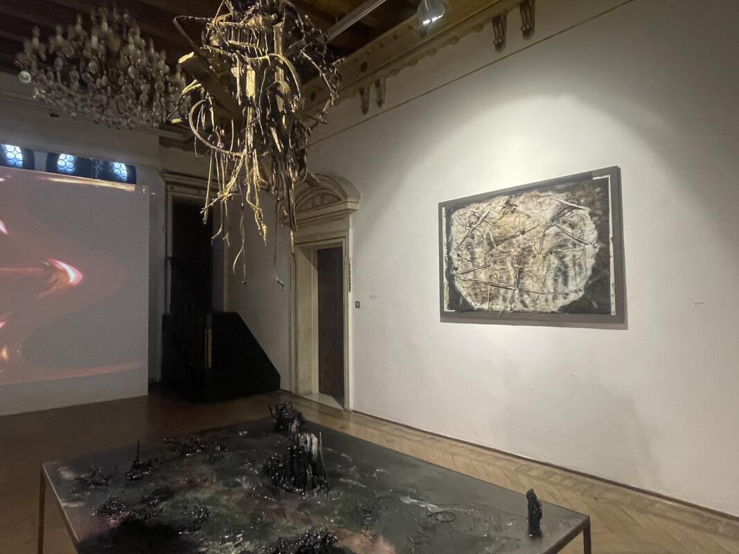 Nella prima sala, quella centrale in mostra che racchiude il lavoro di Agostinelli degli ultimi anni, vicino all’Ultimo uomo compaiono poi opere di nature morte, o meglio doppiamente morte, perché realizzate con fiori e foglie secche ricoperte di colore: <Il colore cade su tutto come per purificarle dall’orrendo crimine commesso contro madre natura> continua la curatrice. Al centro della sala l’installazione “Cuore nel cuore” rappresenta le rovine del contemporaneo, natura rinsecchita e città abbandonate: un disastro che però è sormontato da una navicella dorata che si eleva, segno di speranza. Un’altra opera, realizzata dopo lo scoppio della guerra in Ucraina, inoltre, rappresenta tombe e reperti della contemporaneità. L’Ultimo uomo è circondato poi da oggetti enigmatici che si presentano sotto forme e colori mai visti, compresa la grande opera “Difesa della natura” che rielabora immagini dei documentari che Agostinelli aveva realizzato come filmmaker per Joseph Beuys. In mostra infatti i riferimenti letterari principali sono proprio Beuys e Benjiamin Labatut. Le opere sono quasi tutte composte da materiali di riciclo, come se fossero reperti archeologici dell’era che stiamo vivendo. Così appare anche “Televisioncross”, il vecchio computer cyberpunk ora prigioniero della sua rete di tante informazioni. Quest’ultima opera, che sancisce il passaggio dal digitale alla materia, è molto cara all’artista anche per un aneddoto che la riguarda: durante l’Acqua Granda del 2019 la scultura era infarti stata portata via dalla marea per poi essere ritrovata subito dopo. Fatto questo che conferisce un’aura ancora più potente all’opera che, ora intrisa di acqua salmastra, vede ancora più in corto circuito quella rete di informazioni che sembrava perfetta.