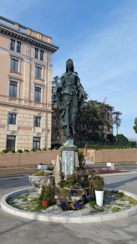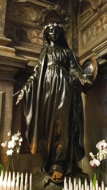 La statua è oggi custodita nella chiesa di Santa Maria di Nazareth, meglio nota come Chiesa degli Scalzi. Originariamente, però, era stata pensata per sostituire la Chiesa di Santa Lucia, demolita per costruire l’omonima stazione ferroviaria: Venne collocata nel piazzale di fronte alla stazione nel 1864 e lì vi rimase fino a poco dopo la Seconda Guerra Mondiale» spiega Padre Ermanno Barucco, priore del convento carmelitano. Non si hanno delle informazioni riguardanti l’artista, ma è possibile notare una somiglianza con le statue delle immacolate francesi di fine Settecento ed inizio Ottocento, in modo particolare con l’iconografia dell’Immacolata posta sulla Medaglia miracolosa del Santuario di Rue du Bac a Parigi, luogo in cui è avvenuta un’apparizione della Madonna.