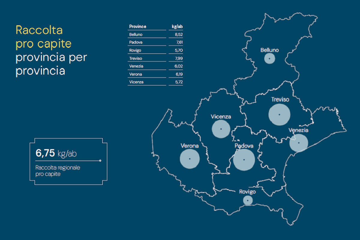 Anche se la raccolta pro capite è diminuita arrivando 6,75 kg per abitante, la quota è superiore alla media nazionale di 5,92 kg e in rapporto tra quantitativo di rifiuti globale e abitanti posiziona il Veneto all’ottavo posto a livello nazionale. «Il Veneto resta leader in Italia per la gestione dei rifiuti urbani con numeri molto importanti – ha dichiarato l’Assessore Regionale all’ambiente, clima, protezione civile e dissesto idrogeologico Giampaolo Bottacin – la raccolta differenziata nel suo complesso arriva a una media con punte del 76%, con alcune realtà provinciali che superano l’80% come Belluno e Treviso, a fronte di una media nazionale del 65%».