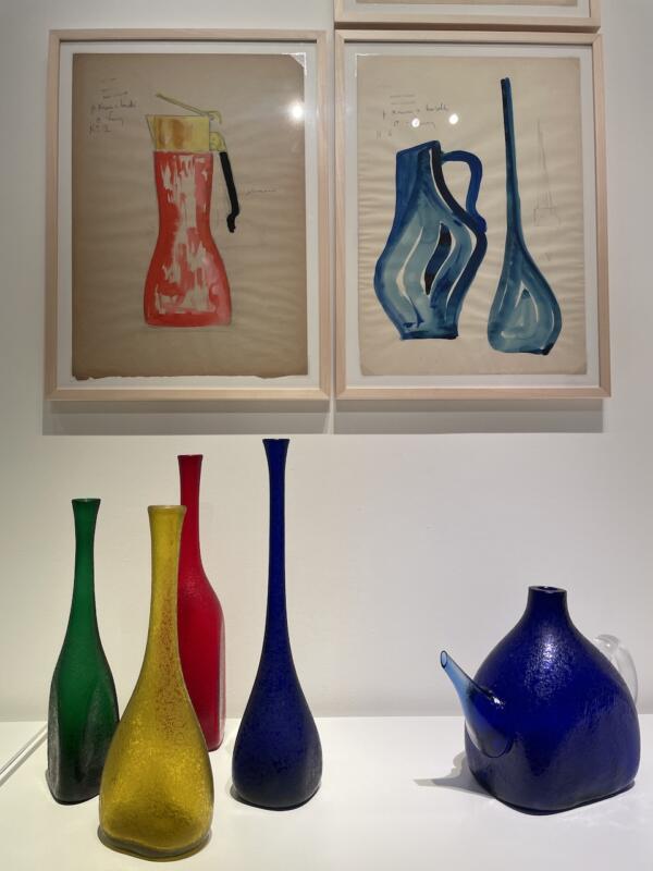 La prima sala evidenzia fin da subito come la peculiarità della NasonMoretti sia legata all’arte della tavola con 400 oggetti dalle forme più varie e dalle colorazioni intense. Il percorso espositivo prosegue cronologicamente con servizi simbolo, come quello da rosolio per il Vittoriale del 1930, databile con certezza visto che a cavallo tra le due guerre gli ossidi disponibili che arrivavano a Murano erano solo il nero e il rosso corallo. Forte di una palette ricchissima e di una costante apertura al nuovo, la NasonMoretti è divenuta un punto di riferimento del design fin dal 1955, quando le coppe Lidia si aggiudicano il Compasso d’oro: <Le coppe nascono da un’intuizione formidabile di Umberto Nason, che decide di applicare la tecnica dell’incamiciato invertito>. Si tratta di una rivoluzione stilistica e tecnica: se normalmente l’incamiciato prevede il colore all’esterno e il bianco latte all’interno, la novità consiste nell’invertire i due fattori. I colori si appropriano di forme quasi d’ispirazione nordica, dando vita ad un classico senza tempo. Una serie di vetri, questi, che due anni più tardi, nel 1956, l’architetto Philip Johnson dona al museo MoMa di New York. Sempre selezionati per il MoMa, agli anni ‘50 appartengono i bicchieri del progetto arlecchino con base rientrante dello scultore muranese Giovanni Gariboldi. Non manca una lampada realizzata nel 1923 che fa parte delle sperimentazioni dell’azienda.