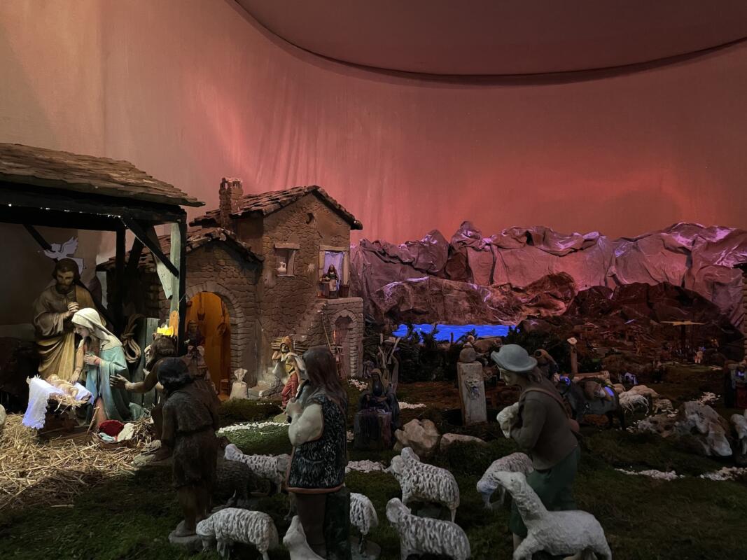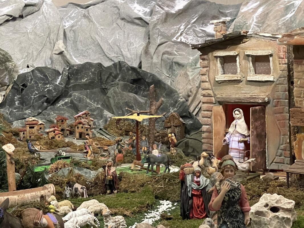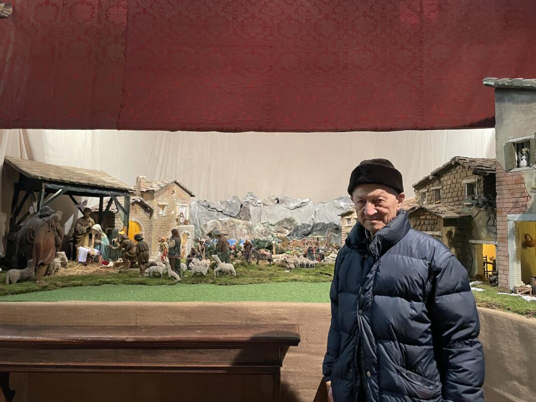 Una parte del presepe è infatti dedicata proprio ai più piccoli, che ogni anno si recano con le loro famiglie per vedere lo spettacolo dell’unico presepe in movimento ormai realizzato in città. «Ho organizzato una parte del presepe con bambini che giocano in gruppo. Quest’anno ho costruito una giostra antica con catene trainata da un asinello che si aggiunge alle statuine degli anni scorsi dei bambini che si dondolano sulle altalene – anticipa padre Sergio – Il mio vuole essere un segno di speranza per il futuro, come segno che vada tutto bene. I bambini sono la festa della famiglia». La struttura realizzata con tubi innocenti su un’ impalcatura di 5 x 4 metri e sopraelevata di 80 cm dal pavimento, che bisogna predisporre almeno un mese prima della realizzazione del presepe, è realizzata con stampo prospettico, che dalla capanna in primo piano poi man mano vede i personaggi rimpicciolirsi fino a che non raggiungono le lontane montagne innevate. Quest’anno le statue in primo piano davanti sono di legno molto grandi e pregiate: «Un tempo le bloccavano sul tavolo con i chiodi perché non venissero portate via» ricorda padre Sergio. Oltre a queste non mancano gli altri personaggi motorizzati che padre Sergio negli anni ha realizzato con le sue mani, una passione che ogni volta lo porta a crearne di nuovi, di varie dimensioni, così da adattarli al presepe che di volta in volta cambia e viene modificato il gioco prospettico.