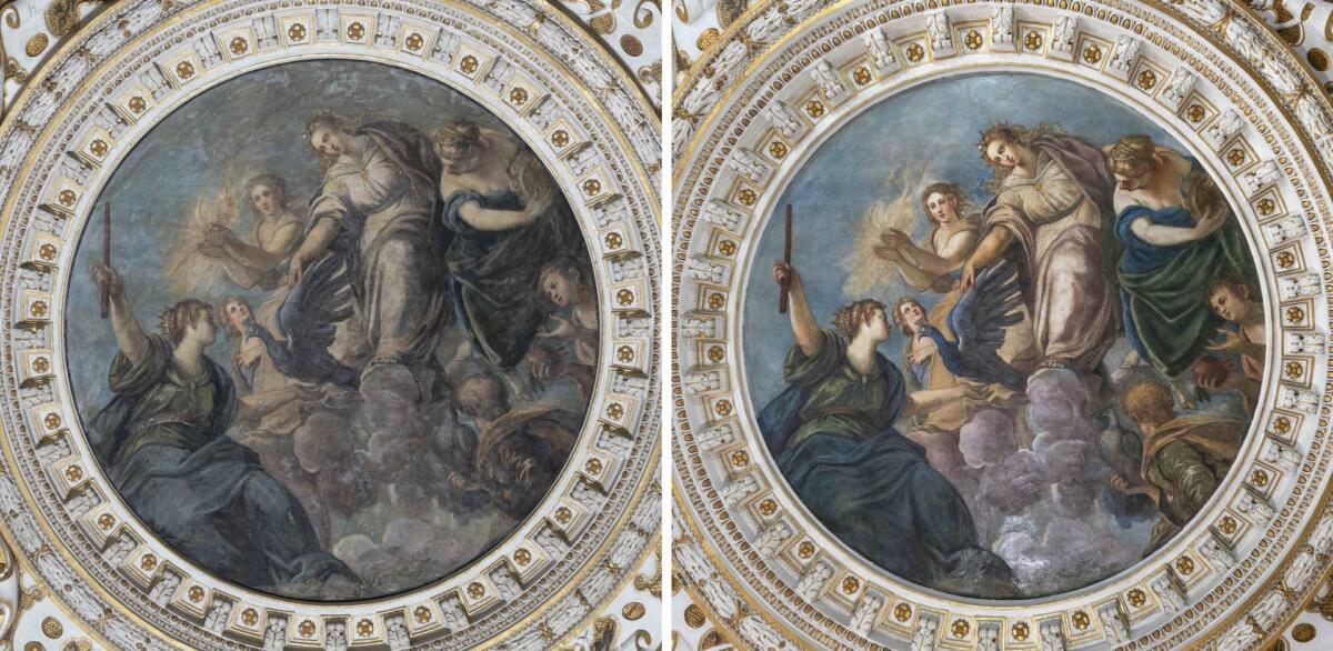 Durante l’intervento, lo studio dei dipinti del soffitto ha portato a una delle scoperte tecniche più rilevanti del progetto: le opere non sono state realizzate ad affresco, come si credeva, ma prevalentemente con colori ad olio stesi su una preparazione a base di gesso e colla, secondo una tecnica affine a quella della pittura su tela. Una modalità esecutiva che, complici i successivi interventi non sempre documentati, ha reso col passare del tempo più complessa la conservazione delle superfici e la loro lettura, unita alla fragilità del supporto esposto costantemente alle infiltrazioni di acqua meteorica provenienti dal tetto che hanno determinato nei secoli un inesorabile deterioramento. Il lavoro ha quindi previsto una dettagliata mappatura dello stato di conservazione e una campagna d’analisi che ha consentito di individuare strati aggiunti alla pellicola pittorica originale nel corso dei numerosi interventi manutentivi precedenti. La fase di pulitura ha poi comportato la rimozione di una vernice novecentesca e di alcune ridipinture risalenti a restauri del secolo scorso. Sono state inoltre eliminate vecchie stuccature degradate, la pellicola pittorica è stata consolidata e sono state trattate le numerose fessurazioni e lacune, mentre particolarmente complessa è risultata la fase di consolidamento dell’intonaco. I restauratori hanno poi proceduto all’integrazione delle parti mancanti e delle abrasioni mediante colori ad acquarello e a vernice, al fine di restituire una lettura unitaria ed equilibrata delle superfici decorate. Inoltre, il tondo dipinto “Venezia spezza il giogo della schiavitù” collocato nella parte est del soffitto presentava un’estesa lacuna rendendo necessario lo stacco controllato della porzione più compromessa al fine di essere pulita e consolidata.