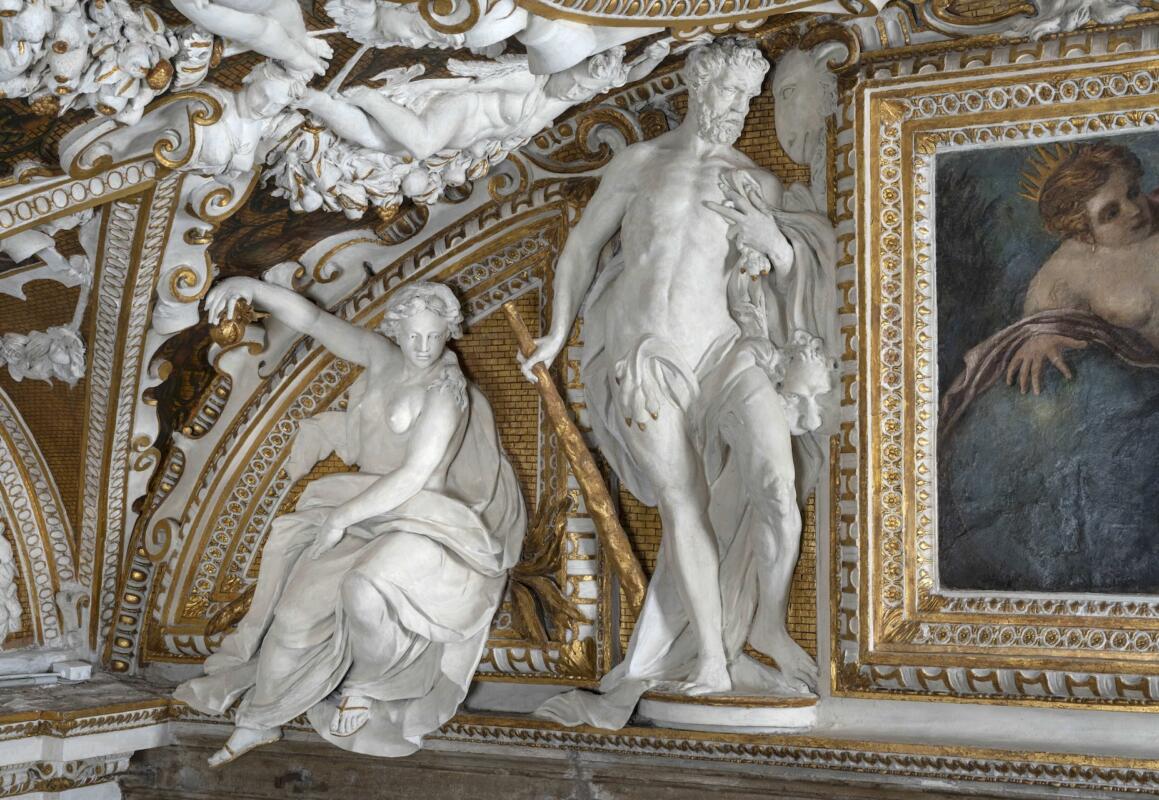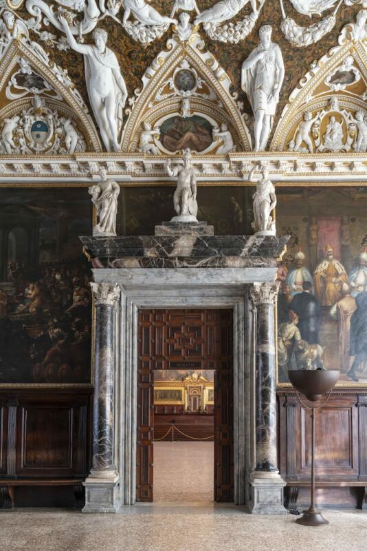 Le opere non sono state realizzate ad affresco come si pensava, ma con colori ad olio. È questa la principale scoperta emersa durante il restauro della Sala delle Quattro Porte, uno degli ambienti di rappresentanza di Palazzo Ducale a Venezia. Il complesso intervento, avviato nel 2023, ha interessato gli apparati decorativi del grande soffitto e i portali lapidei ed è stato possibile grazie al comitato americano Save Venice, che ha stanziato 662 mila euro su un investimento complessivo di 747 mila euro, completato grazie a ulteriori contributi attivati tramite l’Art Bonus, tra cui il sostegno di The Gritti Palace, a Luxury Collection Hotel Venice, unitamente ad investimenti della Fondazione Musei Civici di Venezia di Palazzo Ducale fa parte.Durato oltre due anni, il restauro si è svolto nella forma del cantiere aperto, consentendo ai visitatori di osservare i restauratori al lavoro. La Sala delle Quattro Porte, dall’aspetto sontuoso, fu realizzata su progetto di Andrea Palladio e Giovanni Antonio Rusconi con una volta impreziosita da dipinti murali realizzati in origine da Jacopo Tintoretto e quattro monumentali portali policromi che danno il nome alla sala, coronati da celebri gruppi scultorei realizzati da maestri del tardo Cinquecento veneziano quali Alessandro Vittoria, Girolamo Campagna, Francesco Caselli e Giulio dal Moro. L’intervento nello specifico ha interessato il grande soffitto voltato “alla romana” realizzato per mano originaria da Jacopo Tintoretto che raffigura il mito di Venezia, nonché la parte strutturale e l’apparato decorativo dei dipinti murali e degli stucchi, oltre ai quattro portali lapidei con i soprastanti gruppi scultorei, le finestre lapidee e le tele dipinte a monocromo.